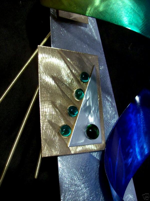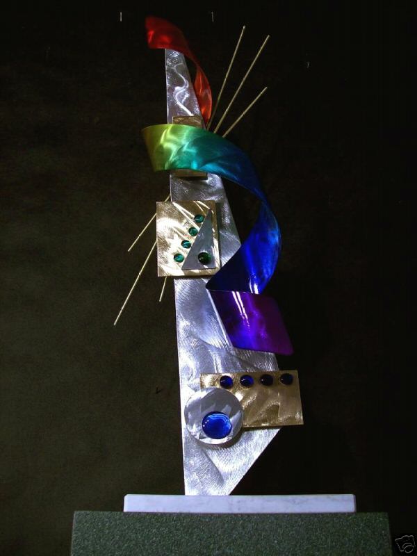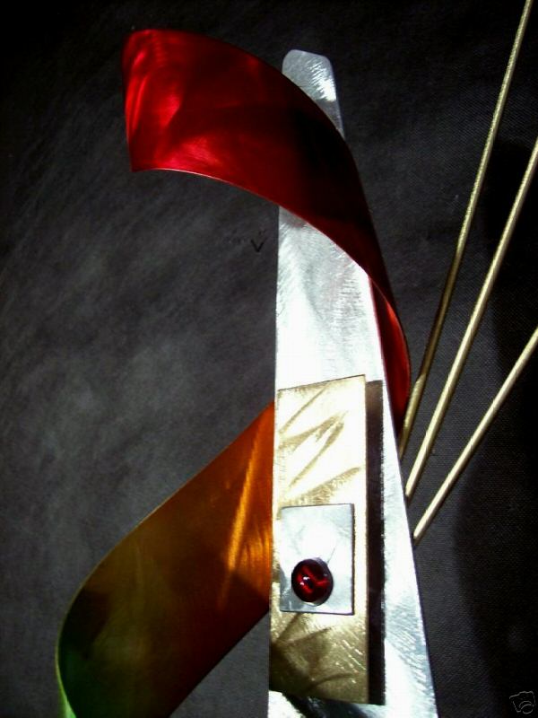 My sculptures are made of the highest grade industrial aluminum available. The transparent anodized enamel that I use is specially developed for aluminum. The colors are protected by the “lacquer” coating that is actually urethane, which blocks out the harmful ultra violet rays of the sun The hangers and the spacers are hand fabricated from aluminum also and designed to line up the plates accurately on the multi panel wall sculptures.