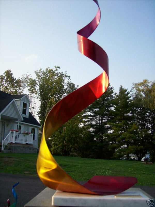 My sculptures are made of the highest grade industrial aluminum available. The transparent anodized enamel that I use is specially developed for aluminum. The colors are protected by the “lacquer” coating that is actually urethane, which blocks out the harmful ultra violet rays of the sun The hangers and the spacers are hand fabricated from aluminum also and designed to line up the plates accurately on the multi panel wall sculptures.