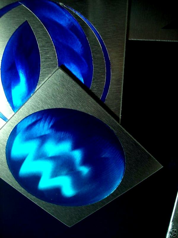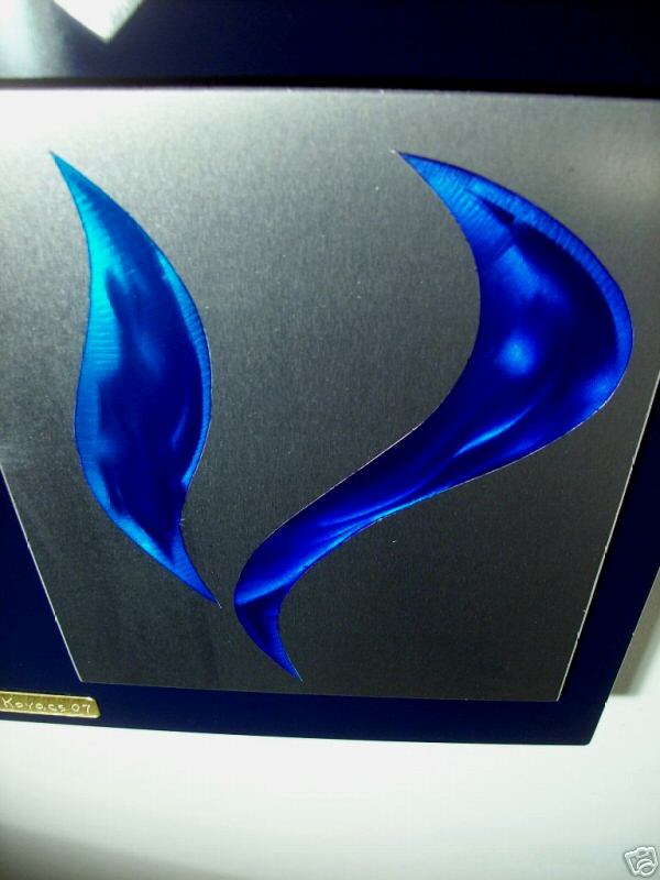 The “swirling” designs are hand grinded into the metal. My famous “holographic” effects that I developed in 2006 and perfected in color in this metal art form, comes to life at any light source one can imagine of, no matter how weak it is. This is a main feature in my work that is duplicated worldwide. Just about all metal artists who decided to hijacked my style, my designs and technique, are trying to profit from this popular “merchandise… 🙂