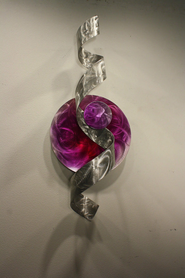My sculptures are made of the highest grade industrial aluminum available. The transparent anodized enamel that I use is specially developed for aluminum. The colors are protected by the “lacquer” coating that is actually urethane, which blocks out the harmful ultra violet rays of the sun The hangers and the spacers are hand fabricated from aluminum also and designed to line up the plates accurately on the multi panel wall sculptures.