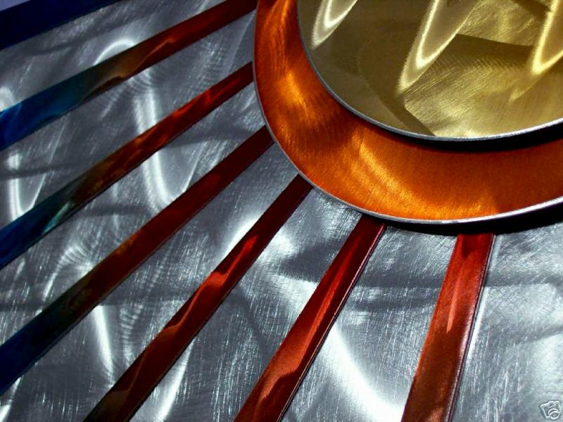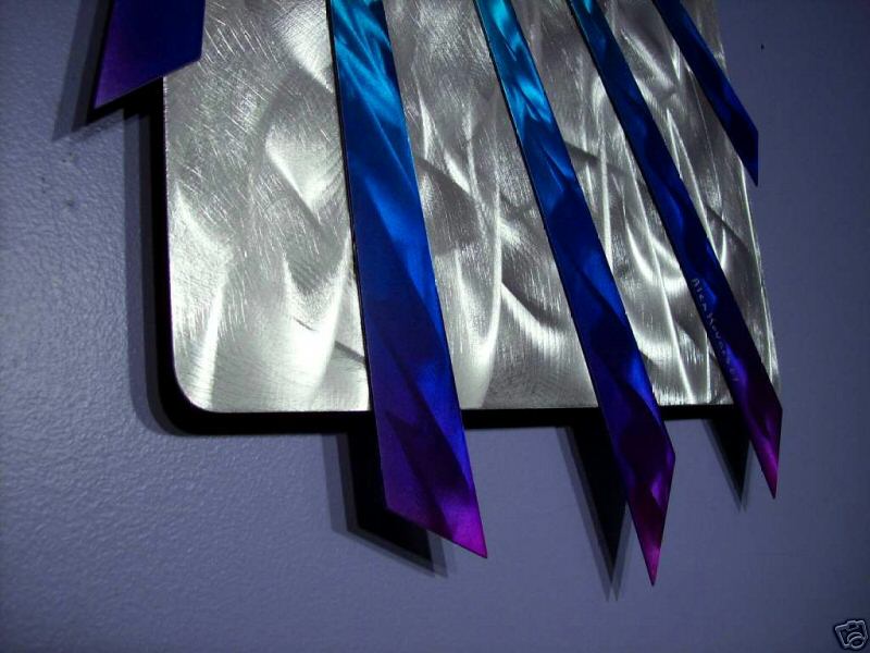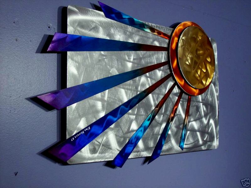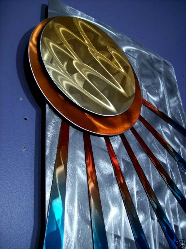 My sculptures are made of the highest grade industrial aluminum available. The transparent anodized enamel that I use is specially developed for aluminum. The colors are protected by the “lacquer” coating that is actually urethane, which blocks out the harmful ultra violet rays of the sun The hangers and the spacers are hand fabricated from aluminum also and designed to line up the plates accurately on the multi panel wall sculptures.