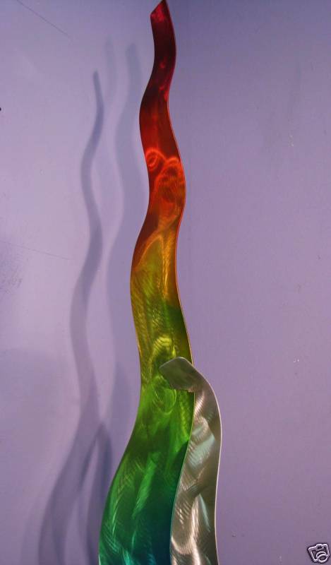 76″ High x 12″ Wide x 12″ Deep. It is mounted on a hand fabricated and welded 24″ High aluminum pedestal, that has a removable rear plate, for an easy access, to anchor the sculpture outdoors.