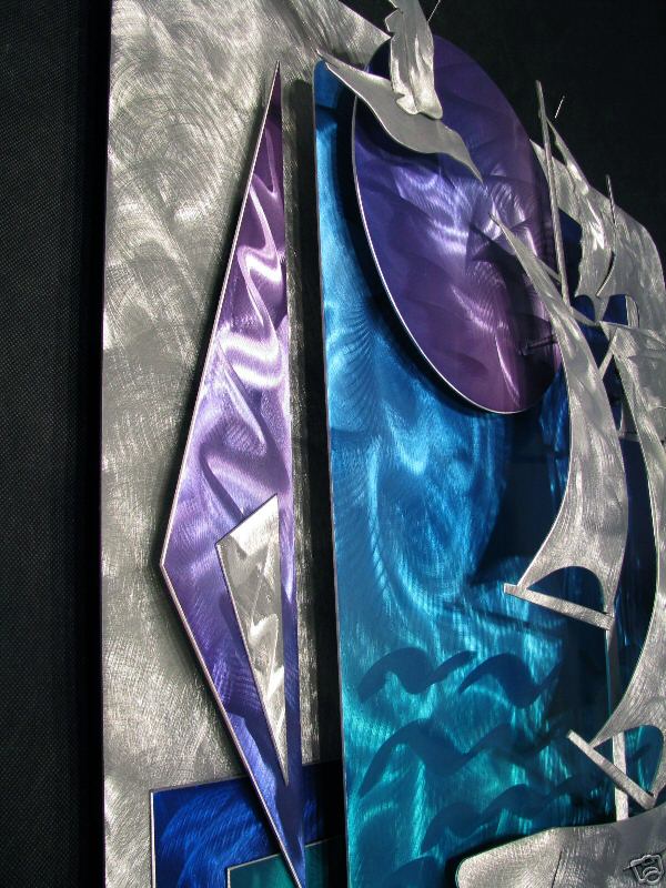 My sculptures are made of the highest grade industrial aluminum available. The transparent anodized enamel that I use is specially developed for aluminum. The colors are protected by the “lacquer” coating that is actually urethane, which blocks out the harmful ultra violet rays of the sun The hangers and the spacers are hand fabricated from aluminum also and designed to line up the plates accurately on the multi panel wall sculptures.
