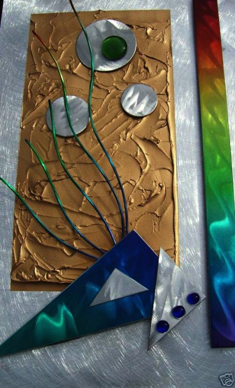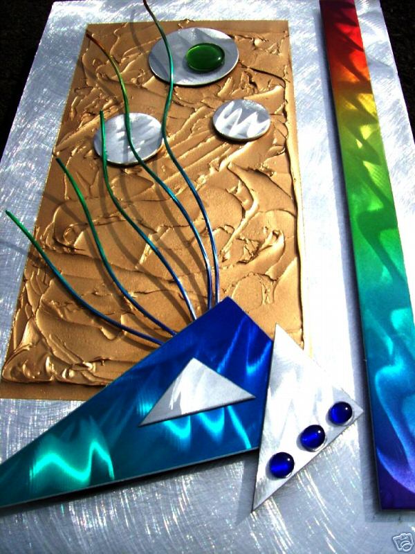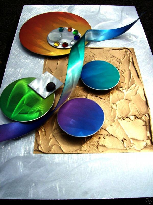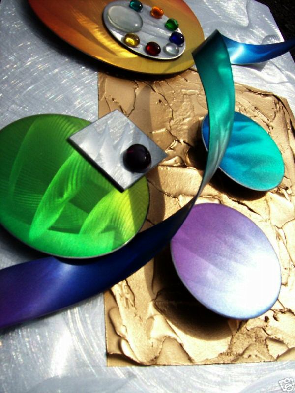 My sculptures are made of the highest grade industrial aluminum available. The transparent anodized enamel that I use is specially developed for aluminum. The colors are protected by the “lacquer” coating that is actually urethane, which blocks out the harmful ultra violet rays of the sun The hangers and the spacers are hand fabricated from aluminum also and designed to line up the plates accurately on the multi panel wall sculptures.
